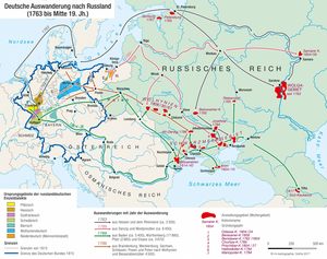 1871 kam es zur Aufhebung der staatlichen Sonderverwaltung für die ausländischen Kolonisten und zu ihrer Eingliederung in die allgemeine Verwaltung. Die Einführung der allgemeinen Wehrpflicht drei Jahre später löste erste Auswanderungswelle nach Nord- und Südamerika aus. Der Landmangel und die Überbevölkerung führten zur Entstehung der Landlosenfrage, zu Aussiedlungen aus den Mutterkolonien und zur Gründung von zahlreichen sog. Tochterkolonien bzw. -siedlungen, vorerst in den benachbarten Gebieten und seit 1880er Jahre verstärkt im Südural, in Sibirien, in kirgisischen (kasachischen) Steppengebieten oder in Turkestan. Von den im Jahr 1914 geschätzten 2,4 Mio. Deutschen im Russischen Reich lebten etwa 550 000 an der Wolga, 530 000 im Schwarzmeergebiet, 550 000 in Russisch-Polen, ferner in Wolhynien, im Baltikum (Deutschbalten) und verstreut in einzelnen Siedlungen und Städten im ganzen Land.